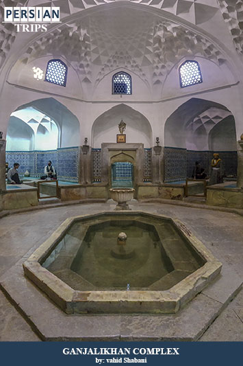 Ganjali Khan Bath of Kerman is one of the most important buildings of Ganjali Khan Kerman complex which is located on the south side of the square and in the middle of Kerman Grand Bazaar and was built in 1611 and its architect was Sultan Mohammad, the architect of Yazdi. This bathroom is a novel work of paintings, mogharnas, tiles and beautiful beds with the use of very delicate stone decorations. This bath is a novel work of paintings, mogharnas, tiles and beautiful beds with the use of very delicate stone decorations. Ganjali Khan Bath is 26 meters long, 30 meters wide and about 1300 square meters of infrastructure, which includes the entrance, entrance hall, locker room, vestibule between the greenhouse, treasury, pool pond, private sector and ton. This bath was open until about 60 years ago, but now it has a tourist use and welcomes many visitors every day, especially during the holidays. In this bath, dressed wax sculptures in the traditional clothes of the people of Kerman have shown scenes of bathing in the traditional way. In addition to these sculptures, various bathroom items are also displayed. These sculptures were designed and transferred to this place in 1973 at the Faculty of Fine Arts in Tehran.