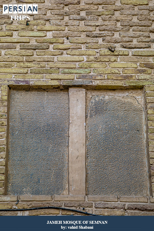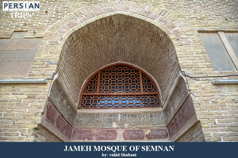 This porch is connected to the dome in the Semnan Centeal Mosque and has a height of more than 21 meters. It was built during the reign of Shahrokh Teymouri and by his minister Khajeh Shamsuddin Ali Balijeh Semnani. In the upper part of the porch and on its body, there is an inscription made of tiles that starts from the north side of the porch and continues after passing from the west side to the south end. The opening of the courtyard is 10.40 meters and behind it there is a square mausoleum with a length and width of 14 steps and a height of more than 14.5 meters which is covered by the Seljuk dome and through two small doors on both sides of the altar to the courtyard of the mosque. And with a few large and small doors, it leads to the surrounding naves. The courtyard of this mosque is rectangular. Its length is 27 meters and its width is 25 meters. The northern nave of the Grand Mosque consists of 16 circular and thick columns on which the multiplicative arches of the nave are based. The east nave is separated from the north nave by the southeast entrance and the south nave by the north.