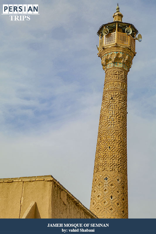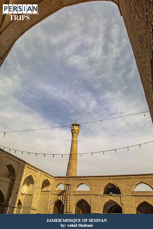 One of the most important and in fact the most prominent parts of this mosque is its minaret. The minaret of the Semnan Central Mosque is one of the historical minarets of Iran belonging to the Seljuk period.This minaret is located in the northeast corner of the Central Mosque. The height of this minaret is 31/20 meters from the ground. 2 meters higher than the roof, there is an inscription with a very beautiful design and pattern of bricks and decorated with Kufic script. Some scholars believe that this building is Manar Janban and even consider it to be the oldest Manar Janban in Iran.This mosque has changed a lot over time. Historical monuments of the Seljuk and Timurid eras can also be seen in this mosque.
